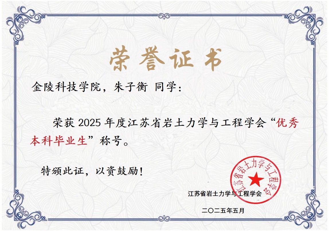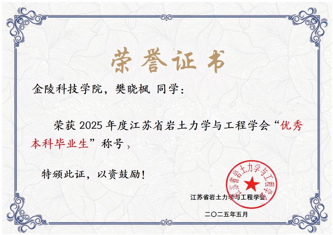 水果派 学子荣获2025年度江苏省岩土力学与工程学会“优秀本科毕业生”称号