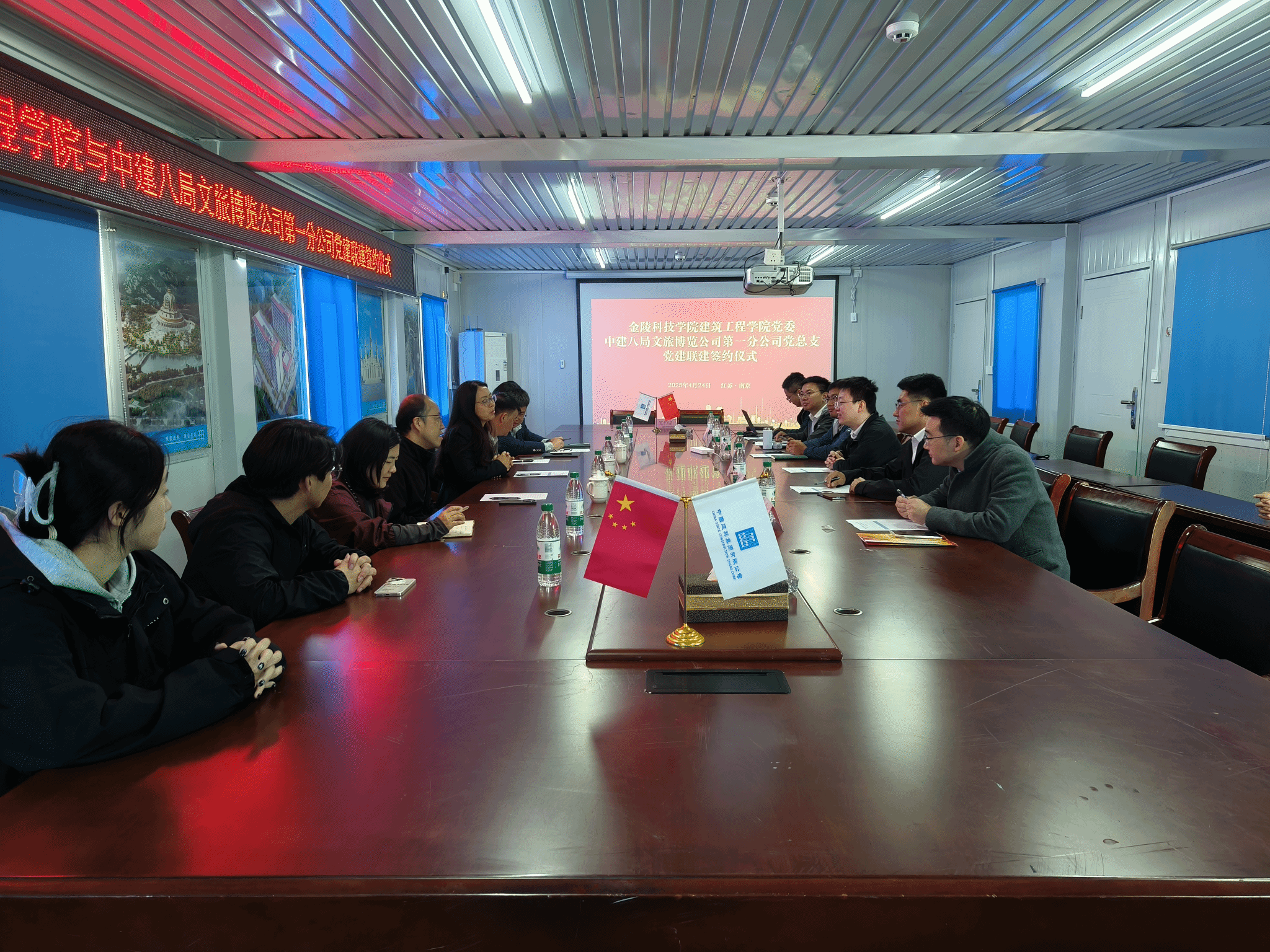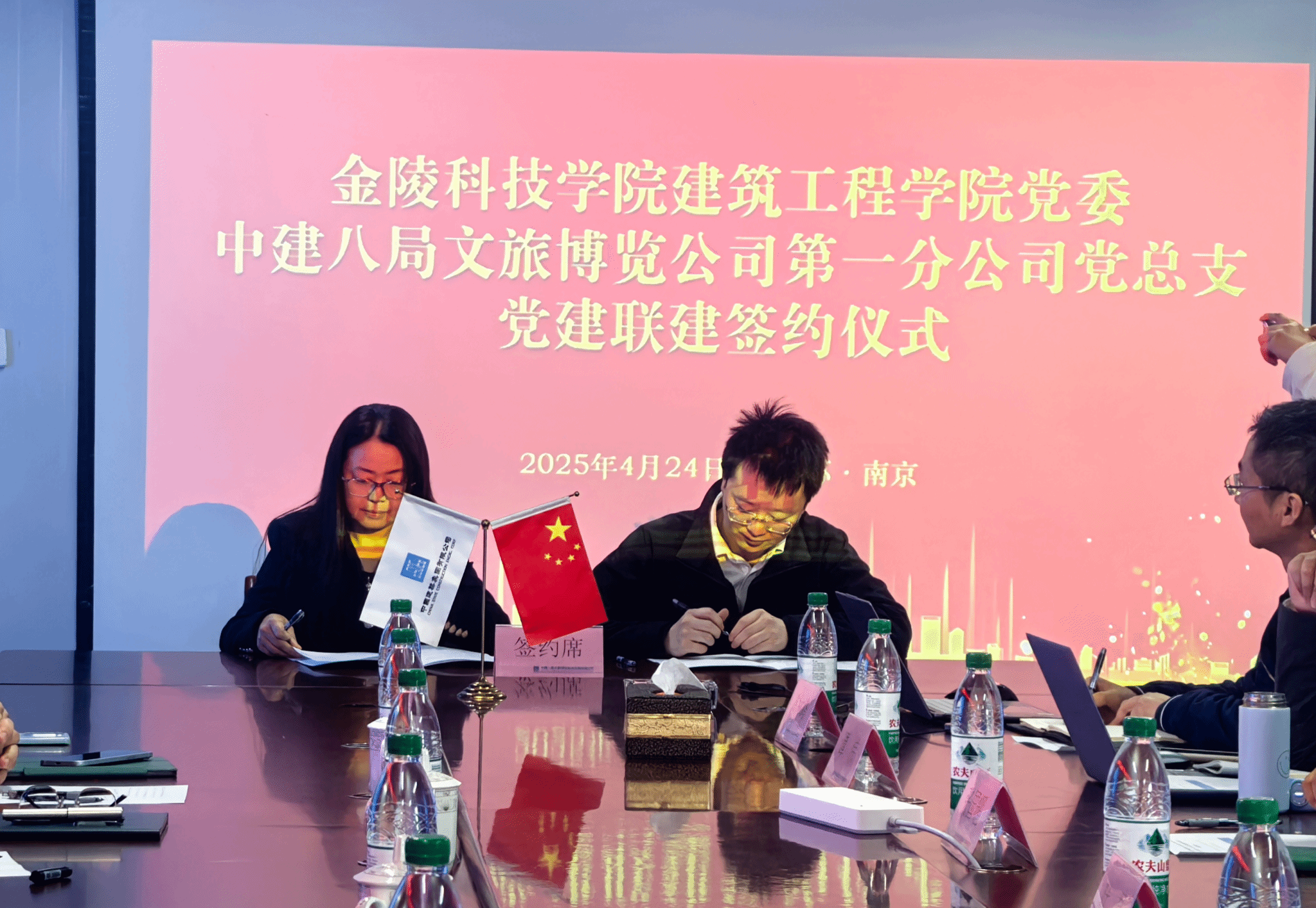 党委率“古建薪声”志愿服务队赴我校新建江宁校区学生宿舍项目施工总承包单位——中国建筑第八工程局有限公司文旅博览公司开展座谈交流。本次活动聚焦党建引领、人才培养与古建保护领域合作,双方就多项事宜达成共识,并现场签署合作协议。